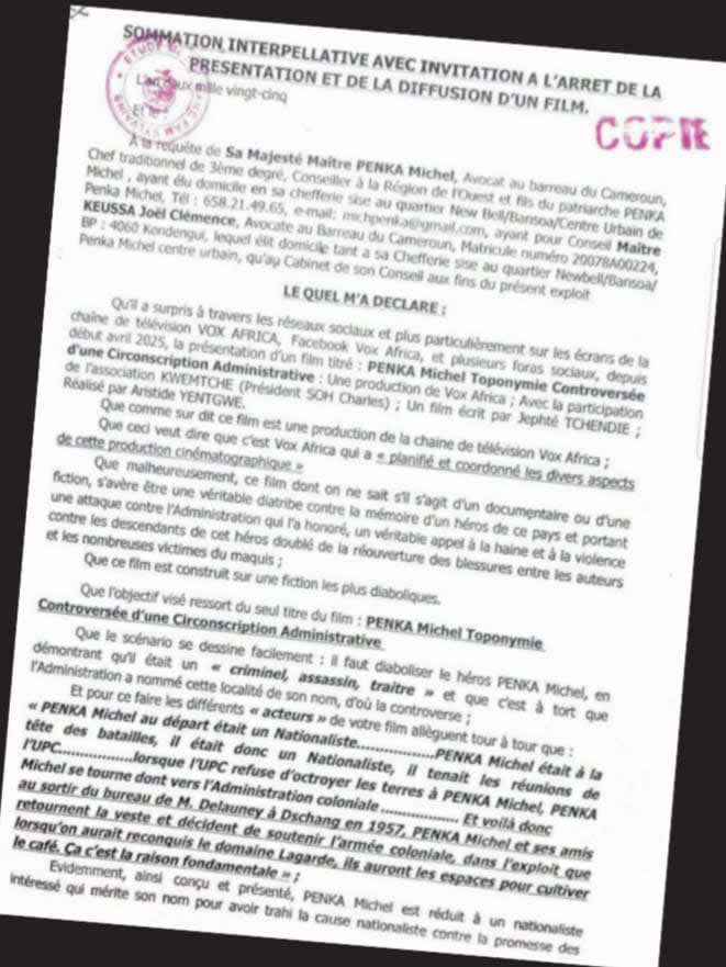 Il y a deux mois et contre toute attente, la chaîne de télévision «Vox Africa» diffuse un reportage à charge contre le Patriarche Penka-Michel dont le titre est : «Penka-Michel : Toponymie controversée d’une circonscription administrative».